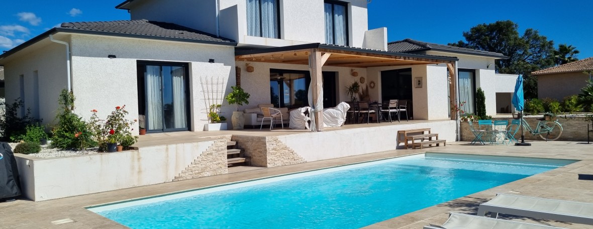 Maison T5 de 120 m² comprenant un salon, une cuisine américaine équipée, une chambre avec salle d'eau, un wc indépendant au rez-de-chaussée. Trois chambres et une salle d'eau avec WC à l'étage. Terrasses. Piscine Terrain de... Lire la suite