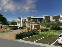 Programme : Deux bâtiments en R+1 composés de 18 appartements du Type 2 au Type 3, 8 villas et garages.